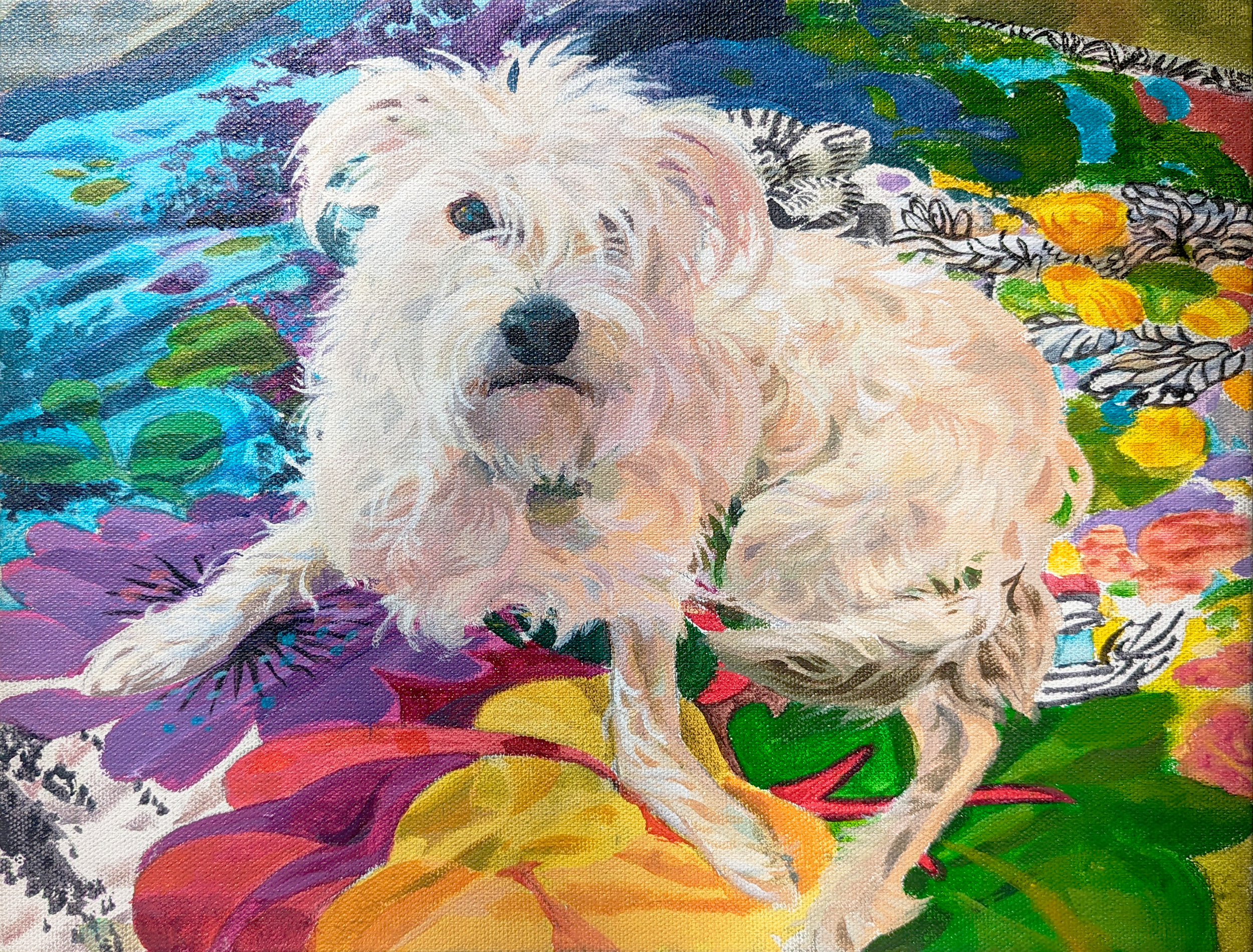 The Process of Rendering “Leeloo” was a joyful exploration of space and color. I began by exploring compositions and color palettes based on photography provided for the final painting. After some playful examples, my client and I landed on the composition of Leeloo laying in bed with hair to one side. For this painting, I took an alla prima approach, laying down colors directly onto the initial sketch. I found myself enraptured in capturing the unique character of Leeloo’s adorable features, and rendering out details to the last strand of hair. This piece was a load of fun, thanks again Bonnie!